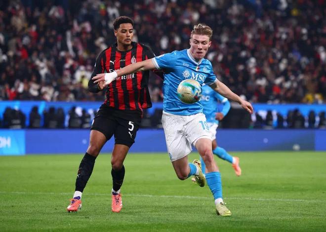 在利雅得的沙特國王大學球場,意大利超級杯半決賽中,赫伊倫和恩昆庫的對比,以一種最鮮明的方式呈現出來。丹麥前鋒傳射建功,助那不勒斯2比0淘汰AC米蘭,毫無懸念地當選本場最佳,以真正屬於中鋒的方式擊潰瞭他本可加盟的“潛東傢”。