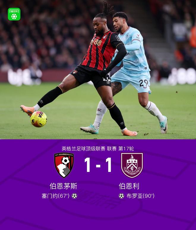 北京時間12月20日,英格蘭足球超級聯賽第17輪,伯恩茅斯主場迎戰伯恩利。比賽中,塞門約為伯恩茅斯打破僵局,取得領先。第90分鐘,愛德華茲傳中,佈羅亞頭球破門幫助伯恩利扳平比分。最終雙方以1-1握手言和。