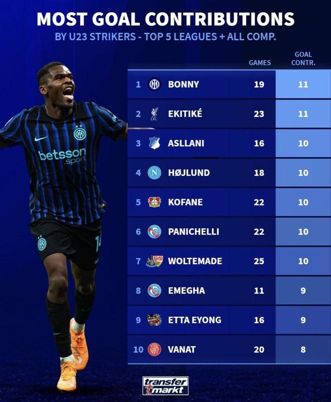 北京時間12月20日,德轉列出瞭本賽季至今歐洲五大聯賽U23前鋒各項賽事直接參與進球數前10,國際米蘭的博尼和利物浦的埃基蒂克同以11球並列第一,霍伊倫、沃爾特馬德上榜。